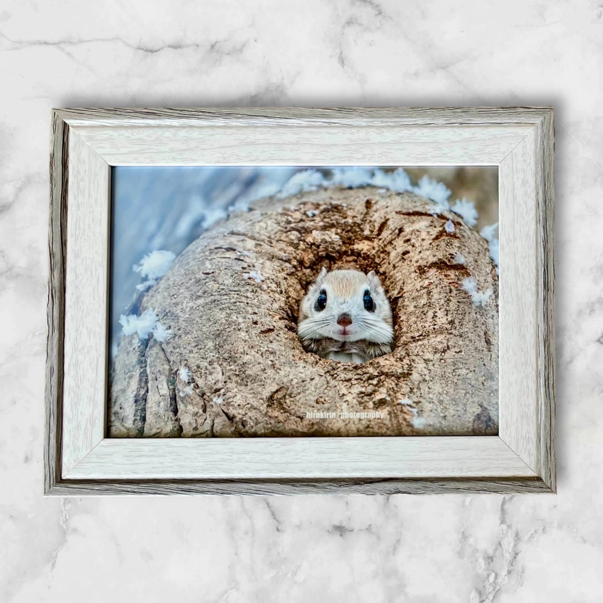 エゾモモンガ写真の額付き2Lサイズです。愛らしいエゾモモンガの姿をお楽しみください。癒される写真は、リラックス効果もあり、癒しの空間を演出します。可愛らしい表情やしぐさが、見るたびにほっこり心を和ませてくれます。